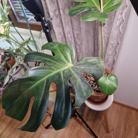 Iso ja muutossa rähjääntynyt monstera low variegation mint, joka on kuitenkin terve ja tekee uutta kasvua. Istutettu mullattomaan aroidmiksiin.