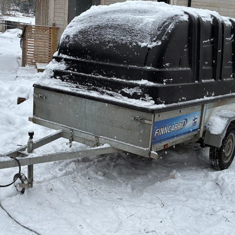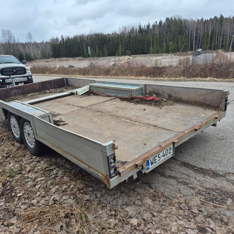 Peräkärry Starset WCG-664, vm 2000, valmistusmaa Suomi, teliakselisto, aisakippi, työntöjarrut, kahdet renkaat 155R13. Suurin sallitttu kokonaismassa 1600 kg, omamassa 420 kg, lujitemuovikuomu 50 kg. Kokonaispituus 4800 mm, kokonaisleveys 1950, etuylitys 1650, takaylitys 1650, aisan pituus 1300, lavan laitojen korkeus 380, lavan sisäpituus 3300, lavan sisäleveys 1500. Katsastettu 9.3.26. ja katsastus on voimassa 2.1.29 asti.