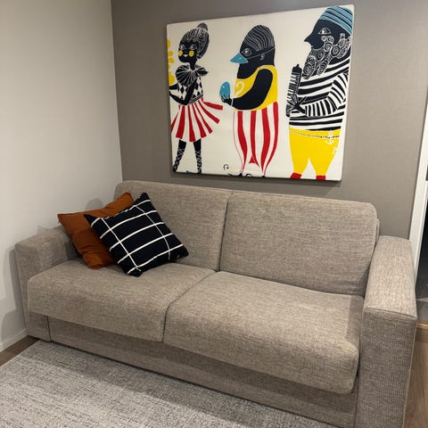 Suomalainen hyväkuntoinen Iskusta 2022 ostettu 3:n istuttava vuodesohva. Chic-mallinen, Naomi kangas, väri luumu.