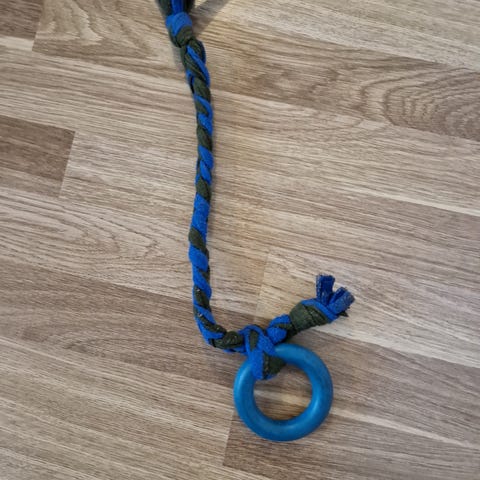 Koiran vetolelu, punainen lenkki ja kuminen pallo päässä.