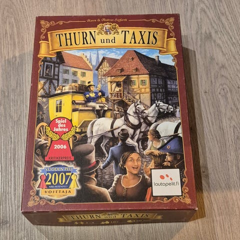 Thurn und Taxis -lautapeli, jossa pelaajat rakentavat postireittejä ja postiasemia historiallisessa Saksassa. Pelissä on pelilauta, kortteja, puisia pelimerkkejä ja ohjekirjat useilla kielillä, myös suomeksi. Tarkoituksena on suunnitella reittejä, kerätä pisteitä ja hallita alueita pelilaudalla. Soveltuu useamman pelaajan strategiapeliksi kotiin tai harrastekäyttöön.