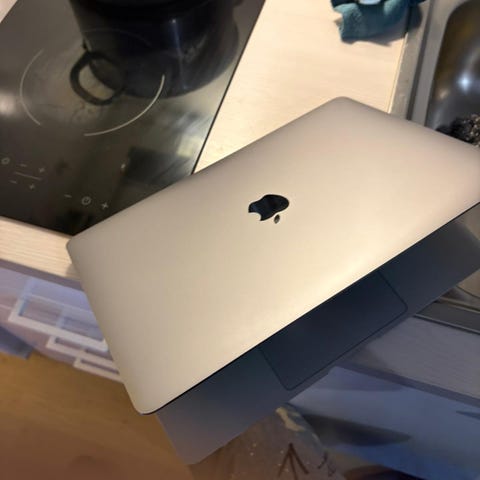 MacBook Air 13” kannettava tietokone harmaalla rungolla. Laitteessa on täysikokoinen näppäimistö, suuri ohjauslevy ja korkearesoluutioinen Retina näyttö. Vuoden 2018 malli. Prosessori 1,6 GHz. Muisti 8 Gt.