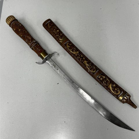 Hakusanat: antiikki, messinki, messinkinen, rustiikki, koristeellinen, miekka, Paketoitava, punainen tuppi