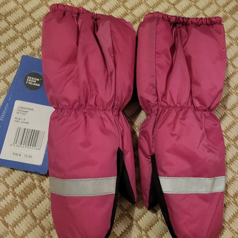 Jonathanin lämpimät talvirukkaset, niissä on heijastava kolmiokuviointi sekä lämmin turkisvuori. Koko 4