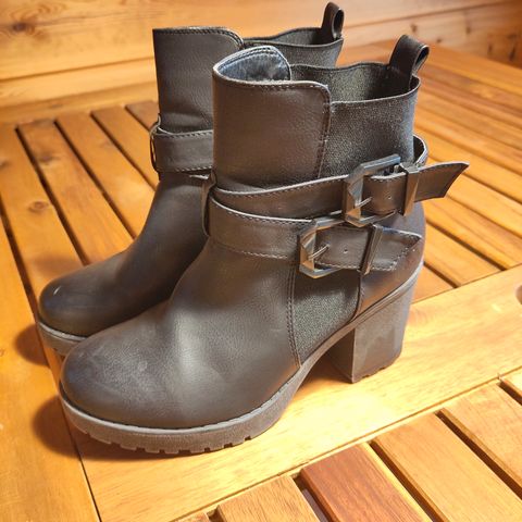 Fuzz merkkiset mustat hyväkuntoiset nilkkurit vetoketjulla. Lisäksi irtovarret hillityllä strassikoristeella. Kenkiä käytetty kerran, säilytetty omissa kangaspusseissa. Mukaan lisäksi uudet korkojen kantapalat.