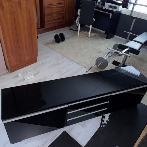 IKEA tv-taso musta. Matala, pitkä taso, jossa useita lokeroita ja etupaneeleissa vaaleammat osiot. Soveltuu television ja viihdelaitteiden sijoittamiseen sekä säilytykseen olohuoneessa. Materiaali vaikuttaa olevan puupohjainen kalustelevy, värinä tumma/musta. Mitat eivät käy ilmi kuvista tarkasti, mutta taso on suunniteltu seinän viereen lattialle asetettavaksi.