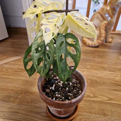 Pitkäksi venähtänyt, hyvinvoiva kasvi. Samassa ruukussa kasvaa pikkuinen monstera adasonii green on green, joka on mahdollista erottaa omaan ruukkuun.
