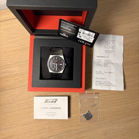 Tissot miesten rannekello. Kellossa on pyöreä kellotaulu ja musta nahkainen ranneke. Kuori on metallia, väriltään kullan sävyinen. Analoginen näyttö. Mukana alkuperäinen Tissot-laatikko ja käyttöopas kuvien mukaisesti. Lisäksi laatikosta löytyy ostokuitti vm 2021 sekä virallinen takuukortti. Koneisto on vedettävä Powermatic 80. Kellotaulun reunoilta löytyy vähän rosoa koska kello ollut joskus pöydällä lasi alaspäin. Malli on Googlettelun perusteella yllättävän harvinainen nykyään (loppuun myyty).
