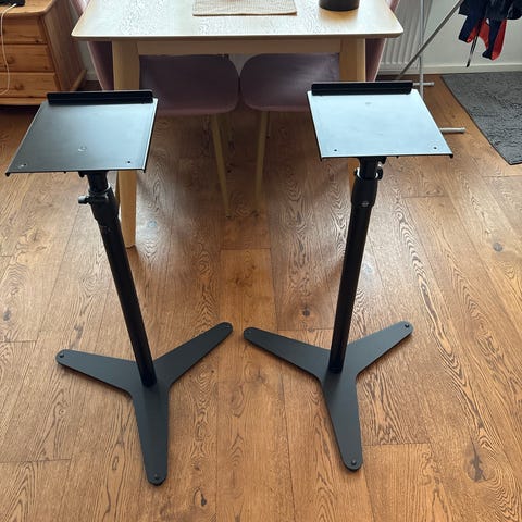Edulliset lattiatelineet studion monitorikaiuttimille tai miksei muillekin. Ostettu Thomannilta muutama vuosi sitten ja ollut sisäkäytössä kotona. Nykyään on monitorit pöydällä niin nämä on jäänyt turhaksi itselle.