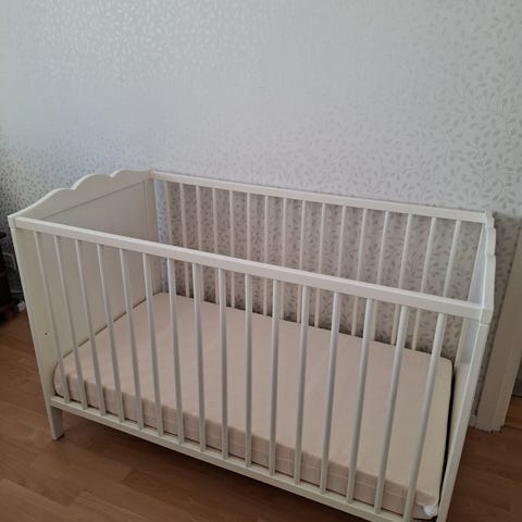 Ikea Stuva pinnasänky, josta toisen pinnalaidan saa irti. Kun lapsi kasvaa, tilalle saa pienen lisälaidan, jonka kanssa taaperon on turvallista nukkua. Myös toinen pinnalaita kuuluu kauppaan sekä lisälaita. Sängyn pohjan voi nostaa keskikorkeudelle, kun vauva on pieni (reiät kiinnitykselle). Alareunassa on kaksi tilavaa laatikkoa, johon saa kätevästi vauvan tai taaperon petivaatteet. Meillä ollut näissä kahden sängyn petivaatteet. Sopii 0-4v lapselle.