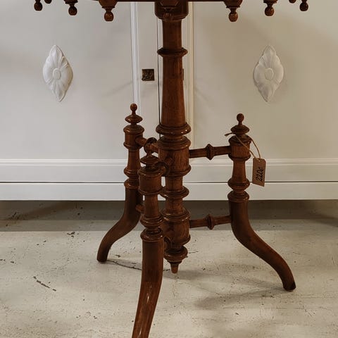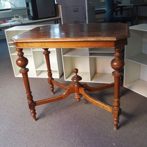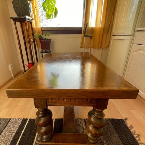 Näyttävä, vanha ja koristeellinen pöytä. Irrallinen kivikansi paksuus 3,5cm, halkaisija 90cm. Puurungon korkeus 53,5cm, halkaisija yläosasta 86cm. Alaosa noin 60*60cm. Sorvatut pallot noin 17cm. Puuosat ehjät ja siistit, jalan sisäpuolelta näkymättömistä joku pala pois. Kivilevyn reunassa jonkin verran pieniä paloja pois. Pinnassa pari "fossiilia", muutamat naarmut voisi lähteä kiillottamalla. Pelkästään kivikansi on hieno käyttää johonkin muuhun.