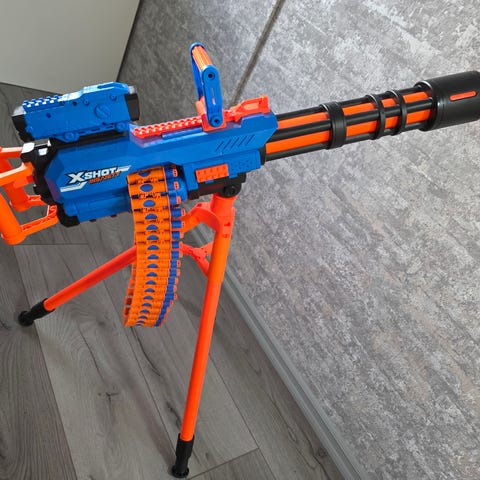 Myydään iso X-Shot leikkikivääri panos kotelolla.