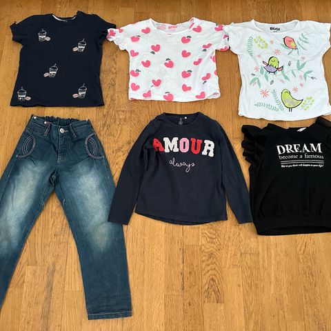 Vaatteissa kokoja 110-128 mutta olleet sopivia 116cm kokoiselle, eri mallisten vaatteiden vuoksi.