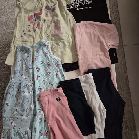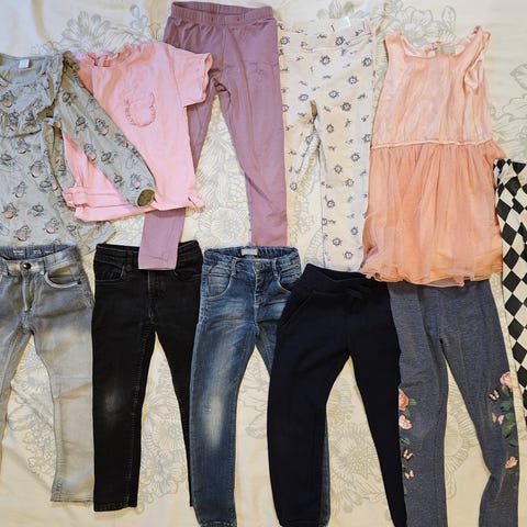 Paketissa mekkoja, housuja, t-paitoja, collareita, yökkäri yms. Merkkeinä mm. Lindex, name it, Kappahl, pomdelux..
