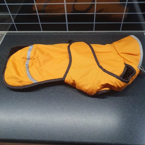 Helposti puettava ehyt talvipomppa keskikokoiselle koiralle. (Meillä edesmennyt vehnäterrieri käytti sitä)