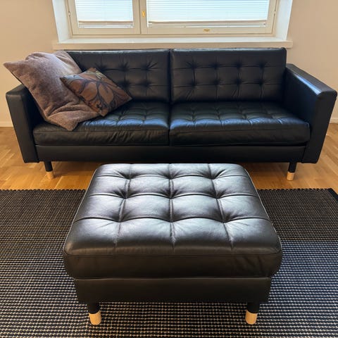 Aito nahkasohva sähkömekanismilla, myös selkänojat kääntyvät. Toisessa mekanismissa jokin kosketushäiriö ei aina toimi heti kun painaa nappia, ollut uudesta asti samanlainen mutta ei ole haitannut käyttöä joten en ole itse jaksanut asiaa tutkia. Sohvan leveys n. 165cm ja syvyys 80cm. Kuvissa hieman likainen. Muuten siistissä kunnossa ja tukeva sekä hyvä istua eikä ole kulunut kun ollut vähällä käytöllä. Pystyy kuljettamaan kahdessa osassa.