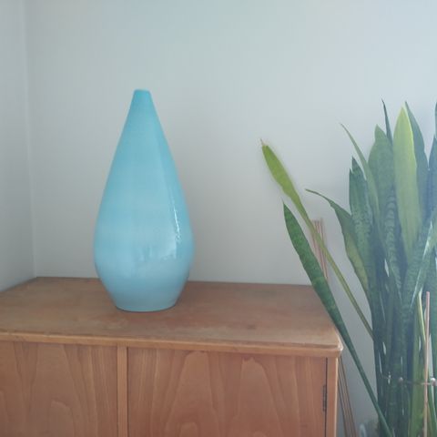 Meripihkan värinen, lasinen, 59cm korkea vaasi. Pölyjen pyyhintä jää ostajalle.