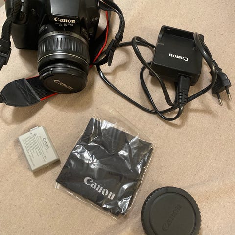 Canon EOS 2000D järjestelmäkamera. Peilijärjestelmäkamera, jossa vaihdettava objektiivi. Mukana kamerarunko, objektiivi, olkahihna, akkulaturi ja virtajohto sekä kameralaukku. Soveltuu valokuvaukseen ja videokuvaukseen eri tilanteissa, kuten arjessa, matkalla ja harrastuskäytössä.