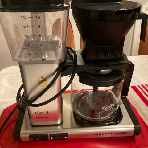 Moccamaster kahvinkeitin kultaisella rungolla ja lasikannulla. Laitteessa on erillinen vesisäiliö, suodatinsuppilo ja lämmitinlevy. Sopii suodatinkahvin valmistukseen kotikäytössä. Runko on metallia ja muovia, kannu lasia ja kahva muovia. Laitteessa on virtakytkin ja lämpölevyn säätö. Väri on kultainen mustilla yksityiskohdilla.