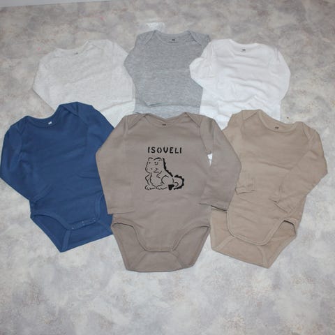 Uusi H&M body, johon käsinpainettu dinosaurus kuva ja minusta tulee isoveli teksti.