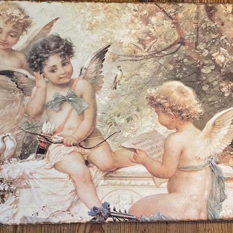 Kaunis ja hyväkuntoinen enkelitaulu. Voin ottaa tarkat mitat halutessasi, mutta arviolta n. 25 x 30 cm. Ei ainakaan isompi.
