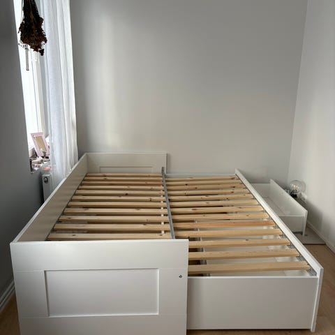 Sohva, yhden hlön 80x200 tai kahden hlön 160x200 sänky säilytyslaatikoilla. Elämisen jälkiä löytyy, suoraan käytöstä (nopea nouto etusijalla, sillä meillä odottaa uusi jo eteisessä). Huom. Yksi laudanpätkä levitettävästä osasta puuttuu! Mukaan saa patjat.