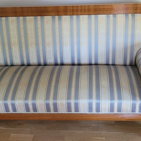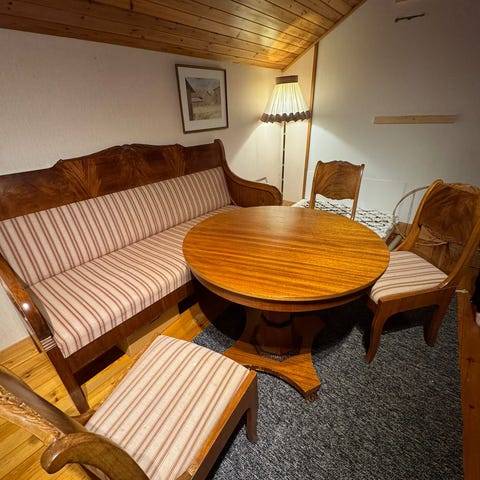Sohva, kuusi käsinojallista tuolia ja kaksi pyöreää pöytää.