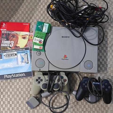 Sony PlayStation SCPH-5552 pelikonsoli.Mukana kuvissa näkyvät ohjaimet, johdot ja pelit.