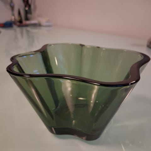 Iittalan opaalivalkoinen Aalto-kulho, koko 19,5 cm x 5 cm. Modernin pohjoismaisen muotoilun klassikko, Iittalan lasitehtaalla suupuhallettu.