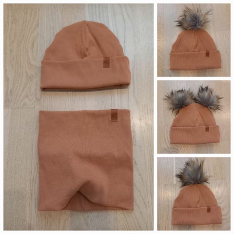 Uusi käsityönä ommeltu setti: kaksinkertaisesta ribbitrikoosta valmistetut pipo ja tuubihuivi. Pipo sopii noin 47-50cm päähän, setti on sopiva noin 2-3-vuotiaalle. Pipon voi valita joko ilman tupsuja, yhdellä tupsulla tai kahdella tupsulla, mikä vaikuttaa setin hintaan, joten selvennyksenä hinnat: