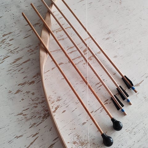 Tästä nuorelle historianelävöittäjälle laadukas lasikuituinen vastakaarijousi, 6 kpl harjoitusnuolia + nahkainen suojahanska vasempaan käteen. Jousen pinta ja kahva nahkaa. Ostettu aikoinaan keskiaikamarkkinoilta, valmistettu käsityönä Unkarissa. Jousen pituus poissa jänteeltä 120 cm, nuolet noin 70 cm. Ollut käytössä noin 10-13 v ampujalla. Paunamäärää en ole mitannut, mutta jousi on jämäkkä ja taitava ampuja ampuu helposti useamman kymmenen metriä. Tämä ei ole pikkulasten lelu.