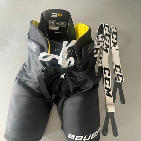 Bauer supreme one40 mustat jääkiekkohousut. Housujen koko aikuisten L, eli sopii noin 175cm-185cm pituiselle pelaajalle. Housujen mukaan bauerin henkselit.