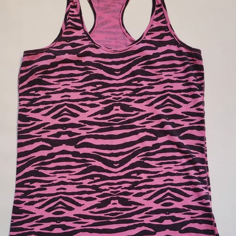 Hyvässä kunnossa, printti hyvä. Takana ja edessä nyörit, etuosan tekstissä pieniä kimalleita. Pysynyt itselläni hyvin ylhäällä paidassa olevan kuminauhan ansiosta.