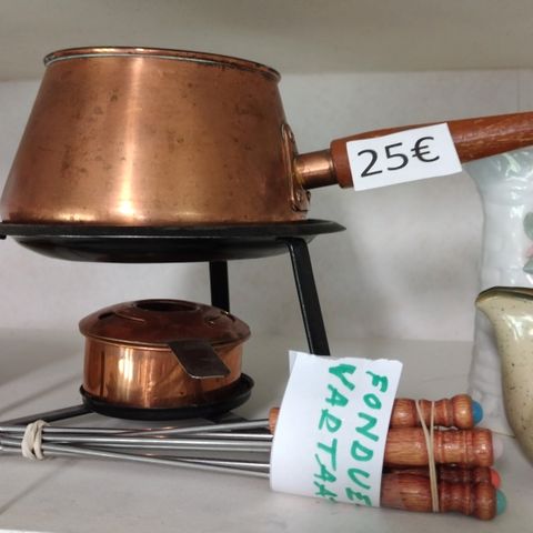 Kerran testattu, laatikossa oleva Roma Beka Fondue setti. Yksi haarukka puuttuu, on otettu johonkin eikä palautettu laatikkoon.