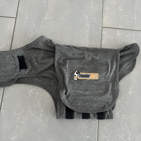 Thundershirt laitetaan koiralle tiukasti päälle ja se rauhoittaa koiraa esim. Ilotulitusten aikana taikka muiden pelkotilojen aikana. Koko S (Ollut meidän n.8kg koiralla josta aika nyt jättänyt.)