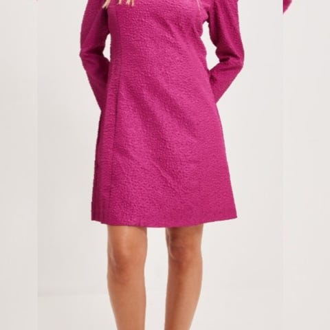 Mekossa korkea pääntie sekä 2/4 pituiset puhvihihat. Imarteleva siluetti, takana piilovetoketju.