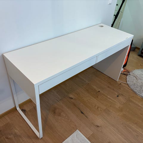 Ikean työpöytä pyörillä, joissa myös lukitus. Pöytälevyssä pari pientä jälkeä, takaosan sivuosa lähtenyt purkautumaan ja fiksattu ruuvilla. TARJOA HINTAA!