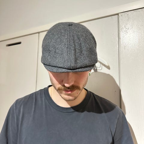 Daks miesten lätsä, villalippalakki. Materiaalina villa, vuorattu sisäpuoli. Kirjava ruutukuviointi vaalealla pohjalla. Koko ilmoitettu miesten M-kokona. Valmistettu Englannissa