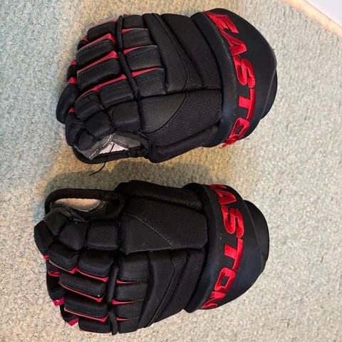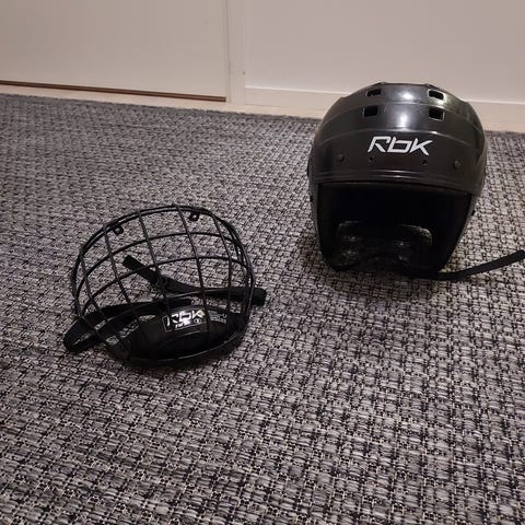 Lasten RBK jääkiekkokypärä ja hanskat. Kypärä on sininen ja varustettu kasvosuojaritilällä, yksi kiristysruuvi puuttuu. Hanskat JOFA, kokoa 23cm/9”