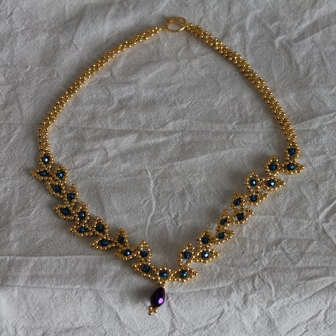 Pienistä lasihelmistä tehty kaulakoru, viininpunaisia ja kultaisia helmiä. Yksi lasihelminauha katkennut ja siima näkyy irtonaisena, sen voi solmia kiinni tai poistaa kokonaan. En ole käyttänyt tätä kertaakaan.