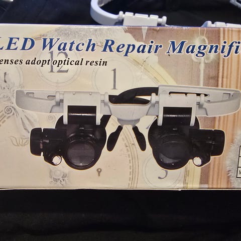 ”Watch Repair Magnifier ja LED Head Loupe suurennuslasit valolla. Pakettiin kuuluu silmälasikehyksiin kiinnitettävä suurennuslasi, jossa on LED-valot tarkkaan lähityöskentelyyn, sekä otsapantaan kiinnitettävä suurennuslasi LED-valolla. Sopivat esimerkiksi kellonkorjaukseen, elektroniikan juottamiseen, askarteluun ja muuhun tarkkuutta vaativaan lähityöhön. Mukana erilliset säilytyskotelot ja vaihdettavat linssit eri suurennoksilla (esim. 1,0x–3,5x), jotka mahdollistavat suurennuksen säätämisen työn mukaan”.