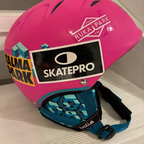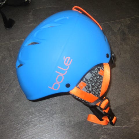 Bollé ”farkku”-tyylinen sininen laskettelukypärä. Pehmustettu sisäosa, kiinteät korvaläpät, säädettävä leukahihna ja ilmanvaihtoaukot. Laskettelu, lautailu