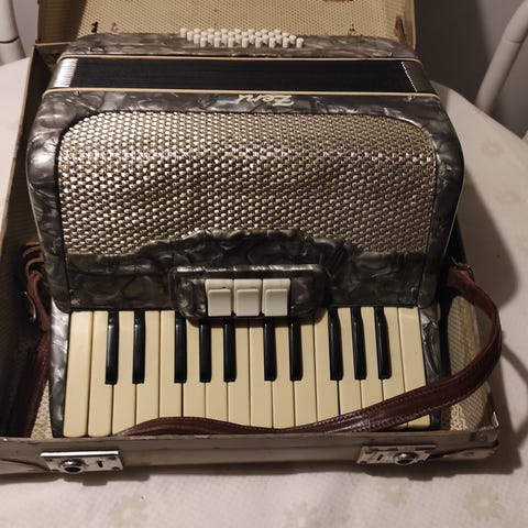 Vanha mutta erittäin vähän käytetty harmonikka merkiltään than ja sen laukku