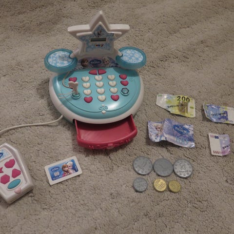 Frozen aiheinen kassakone. Patterit pitää vaihtaa. Leikkirahat on jo ruttuisia, mutta laitan ne mukaan (Frozen kuvilla). Lisäksi muovikolikoita ja pankkikortti.