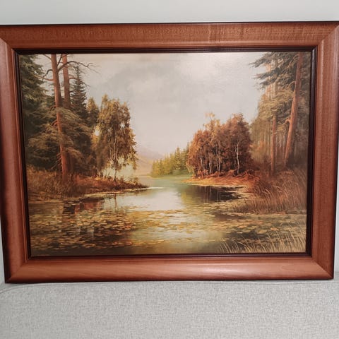 Taulu 35x35cm. Ei tietoa tekijästä. Takana onnittelutekstiä lahjansaajalle. 23 v. sitten saatu. Oikeassa alakulmassa pieni särö lasissa.