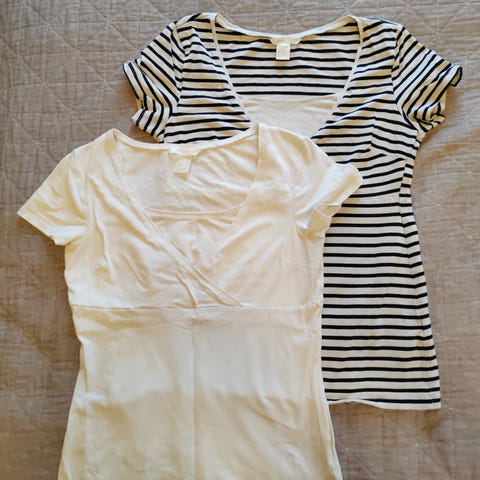 Kietaisumalliset imetyspaidat, koko M. Vastaavat hyvin kokoaan. Meillä hajusteeton pesu ja ei eläimiä. Näistä raidallisessa pientä nyppyä, mutta ihan käyttökuntoinen edelleen.
