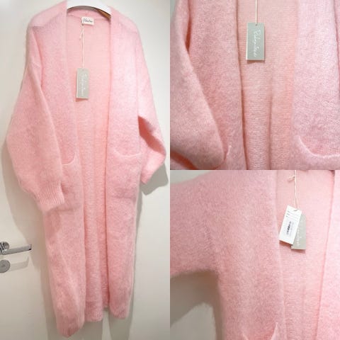 BYPIAS neuletakki naisille. One size -kokoinen, väljä ja pitkä malli. Materiaalina pehmeä mohairvilla-sekoite, neulos on ilmavaa ja kevyttä. Väri vaaleanpunainen. Edessä paikkataskut, ei napitusta. Sopii kerrospukeutumiseen ja arjen käyttöön. Kuvissa näkyy myös yksityiskohtia neuloksesta ja mahdollisista langanpäistä.