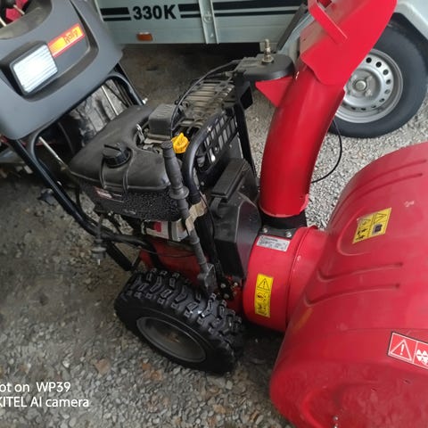Canadiana lumilinko telaketjuilla. Polttomoottorikäyttöinen kaksivaiheinen lumilinko, jossa on telaketjut vetotapana. Laitteessa on eteen sijoitettu lumiruuvi ja heittotorvi lumen poistoon. Moottorin ja rungon tyyppikilvet näkyvät kuvissa, joista ilmenevät valmistaja Canadiana Outdoor Products Inc. ja sarjanumero. Soveltuu pihan ja ajoväylien lumitöihin ja lumen siirtämiseen eri kohteissa.
