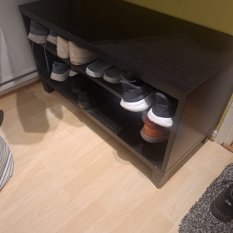 Myydään hyväkuntoinen kenkähylly pehmeällä istuimella. Kangas napakka ja moitteettomassa kunnossa.