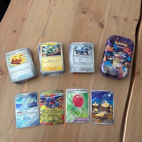 Hyvä setti vaikka aloittelevalle keräilijälle. Pieni kansiollinen kortteja, noin 250 korttia. Ja peltirasia on täynnä trainer/energykortteja. Vain nouto